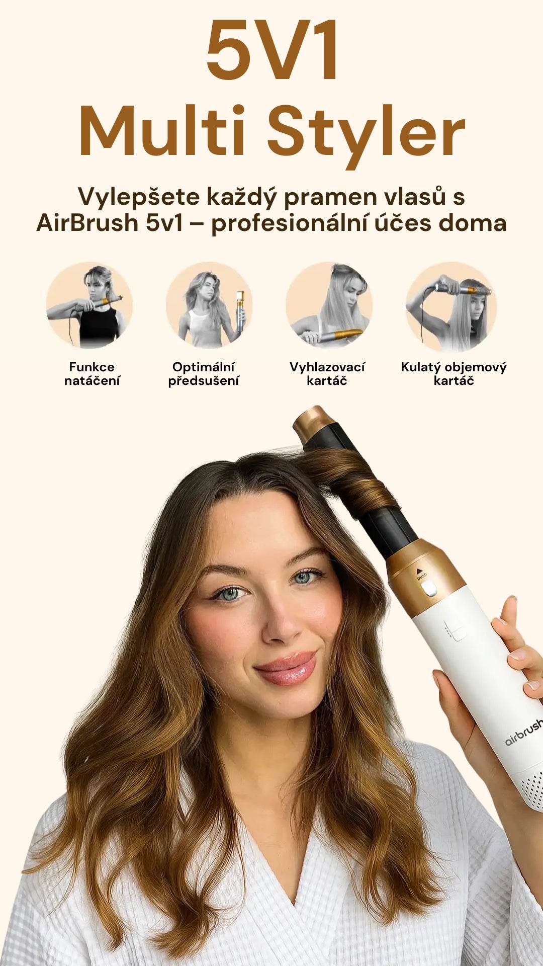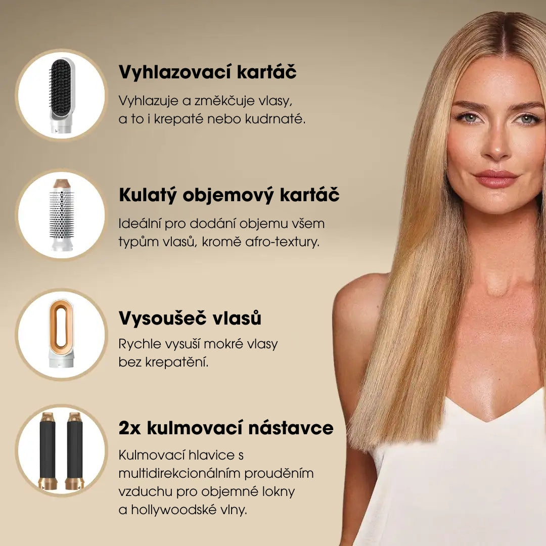 5v1 Multi Styler je dodáván s několika vyměnitelnými nástavci: kulma, vyhlazovací kartáč, hřeben s ohřevem atd.